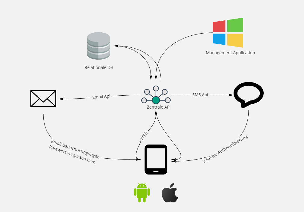 Neben der Anwendung für die mobilen Betriebssysteme ( Android und IOS), ist die API ( .NET Core ) als auch die Management Application auf Basis von Winforms, teil des Projektes gewesen,
